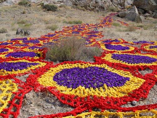 Artist Carol Hummel enhances natural scenes with.... warm clothing. Perhaps one day the rocks and bare vegetation will appreciate her efforts, after an especially chilly night: