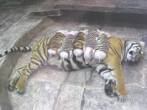 According to this source, the mother tiger pictured above was herself nursed by a pig in infancy and apparently regards the other species as family, not prey: